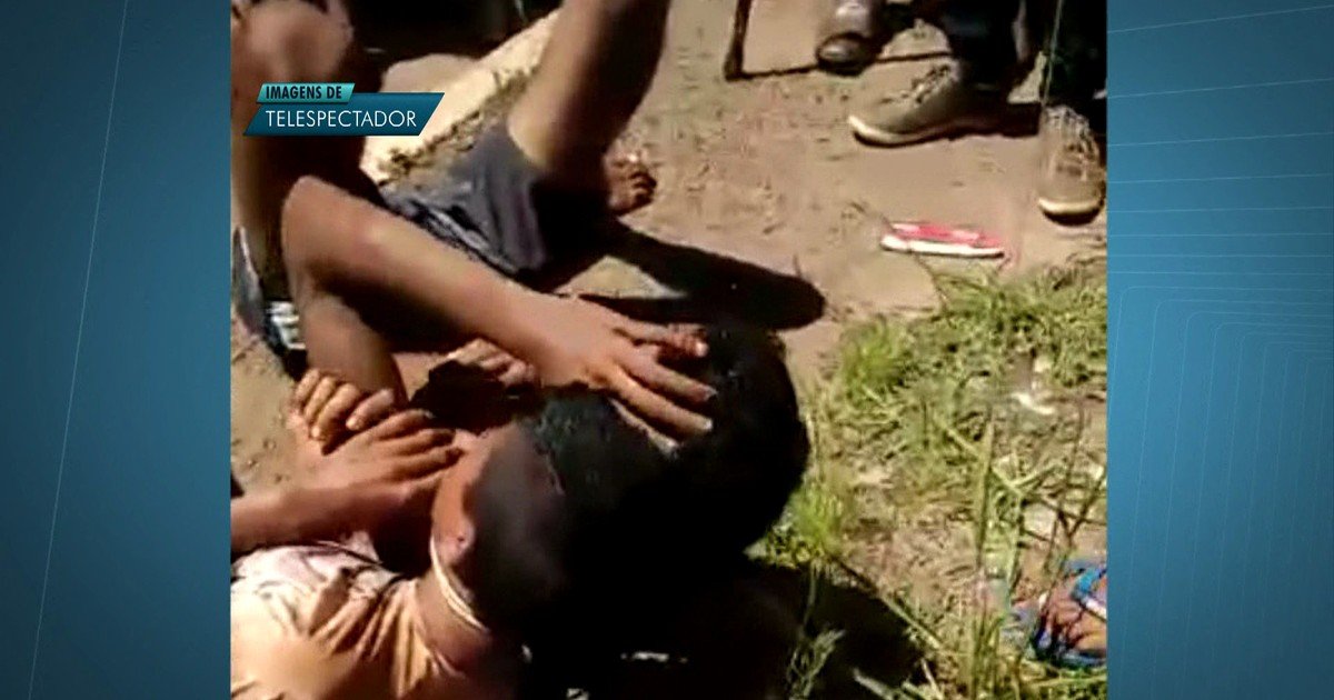 Um adolescente de 17 anos e um jovem de 23 foram detidos suspeitos de roubarem o celular de uma mulher em Valparaíso de Goiás, no Entrono do Distrito Federal. Segundo informações da assessoria de imprensa da Polícia Civil do DF, a dupla foi imobilizada e agredida por populares que viram o crime até a chegada da Polícia Militar. Imagens feitas por testemunhas mostram quando eles apanham e ficam amarrados pelo pescoço um ao outro (assista acima).
