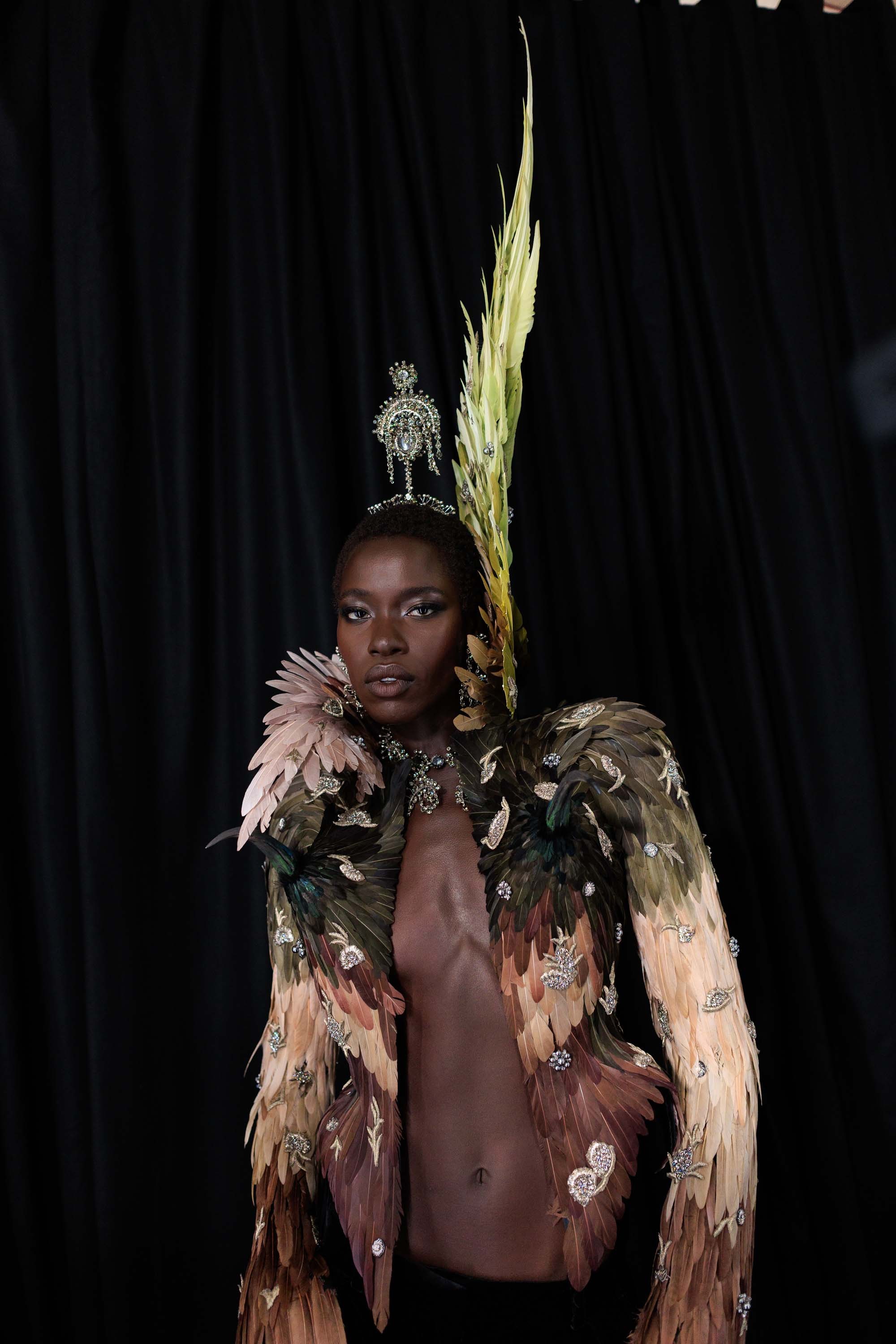 Foi também na natureza que o diretor criativo Matthieu Blazy tirou inspiração para o seu primeiro desfile de alta-costura à frente da Chanel, principalmente nos pássaros. Além dos cabelos texturizados, com diferentes curvaturas e movimentos, e modelos de diversas idades no casting, a variedade de texturas empregadas nas roupas e acessórios foi um dos pontos altos do show. A riqueza como elas foram criadas também: ráfia, bordados e pétalas de organza foram usado para mimetizar penas e escamas. Até os cabelos ganharam um acessório texturizado.