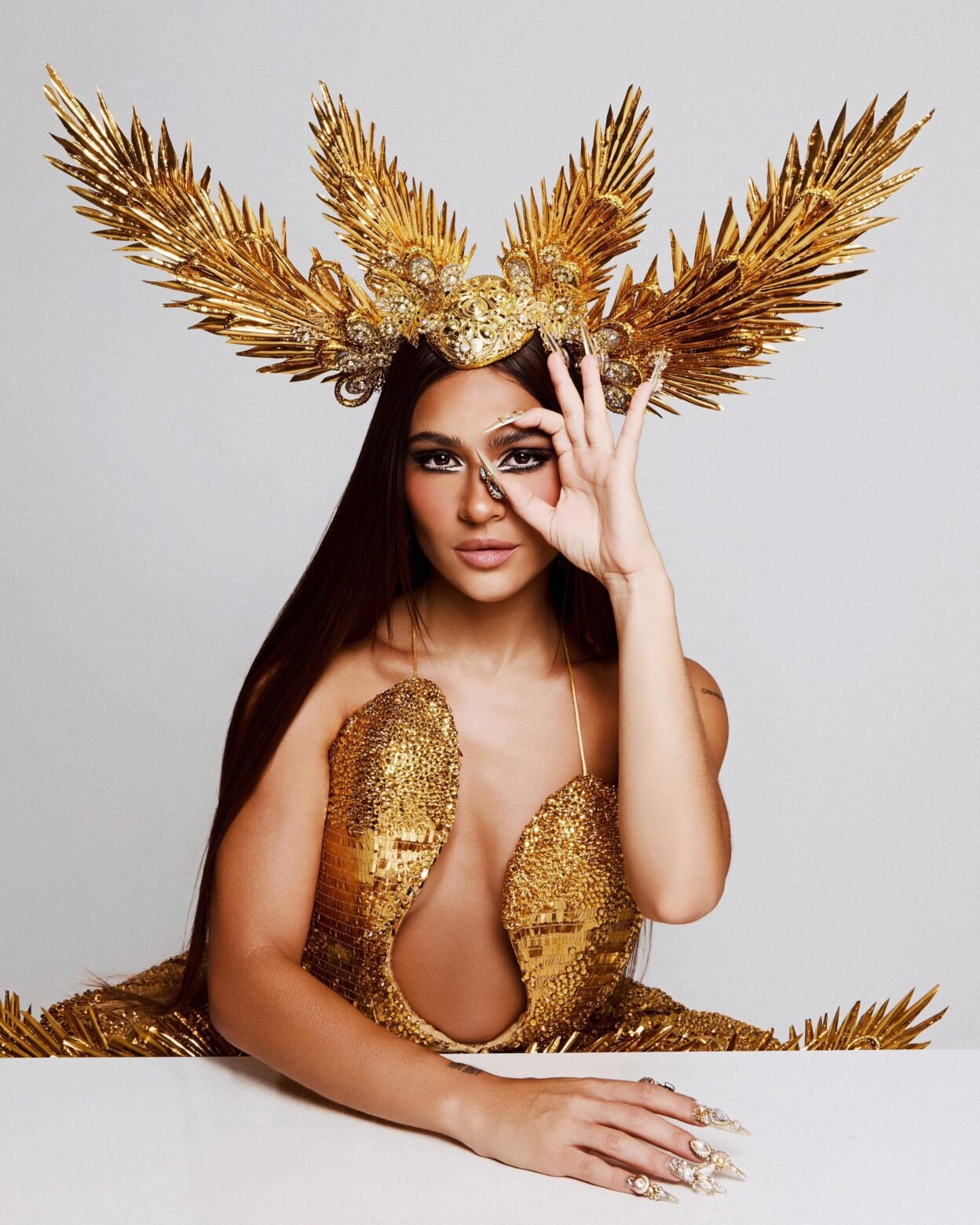 O visual escolhido para a noite foi um vestido dourado de dimensões imponentes, assinado pelo stylist Natan Xirras. Desenvolvida em apenas sete dias, a criação reúne cerca de 7 mil cristais aplicados manualmente e chega a pesar aproximadamente 30 quilos. Mais do que um traje, a peça foi concebida como uma alegoria em movimento, capaz de transformar o corpo em discurso visual.