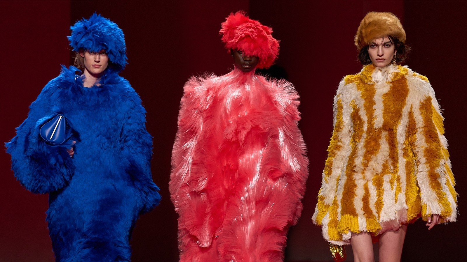 Louise Trotter vem se superando a cada temporada na Bottega Veneta – ainda que tenha estreado há apenas uma. A casa italiana, reconhecida por seu trabalho artesanal, vem sendo moldada com o que a estilista britânica denomina “brutalismo sensual”. Entre os destaques do riquíssimo trabalho de texturas desfilados hoje em Milão estão os casacos de fibra óptica em vidro reciclado, apresentados em sua primeira coleção e que agora surgem em versão sobretudo, e as peças que imitam pele, mas que são feitas com lã desfiada e seda bordada.