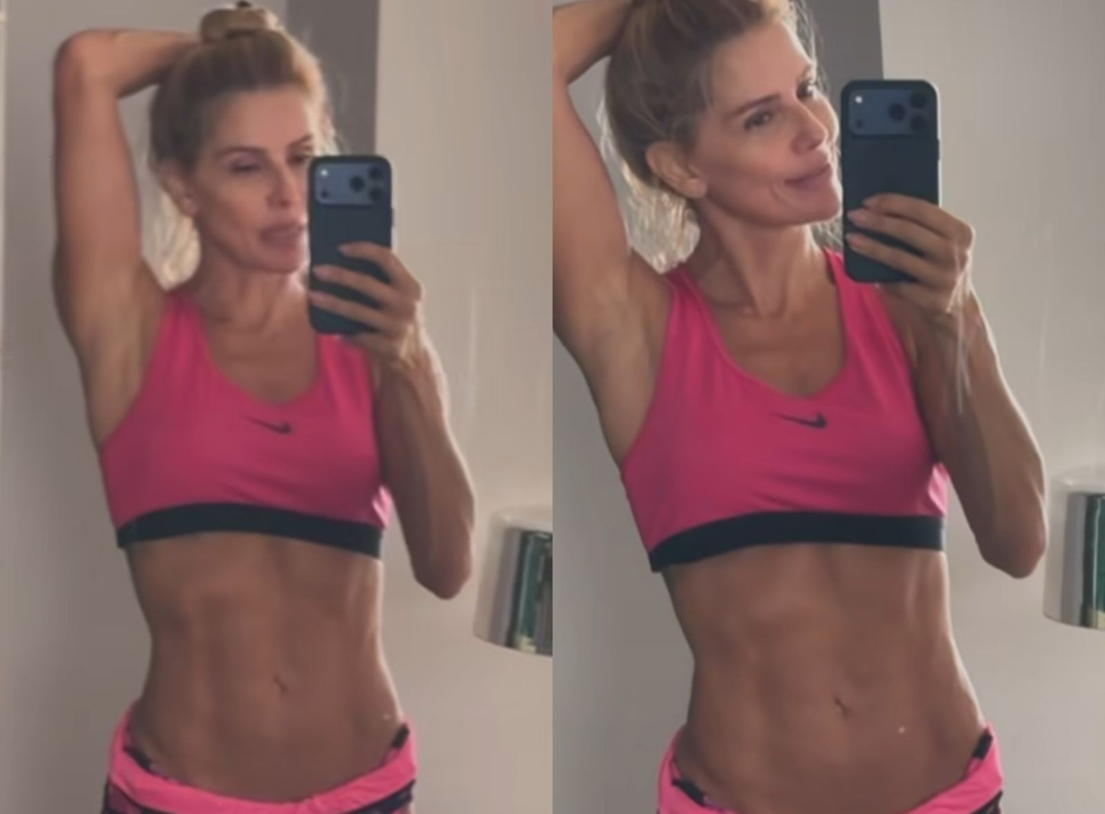 Na gravação, Secco aparece usando um conjunto fitness barbiecore, composto por top e short. O look deixou seu corpo sarado, bronzeado e definido em evidência.