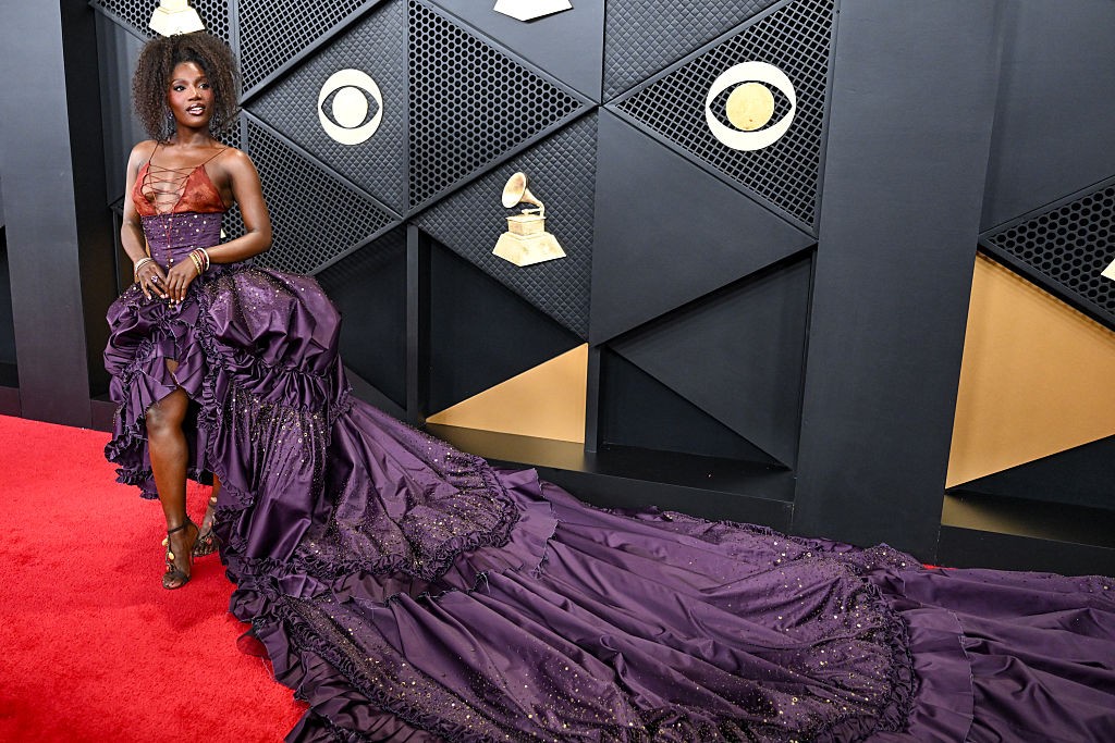 A cantora norte-americana, que concorre a cinco categorias por “Anxiety”, incluindo Gravação do Ano e Melhor Canção de Rap, chamou a atenção dos fotógrafos ao surgir com um vestido com uma maxi cauda roxa e cheia de cristais e corpete transparente do estilista Roberto Cavalli.