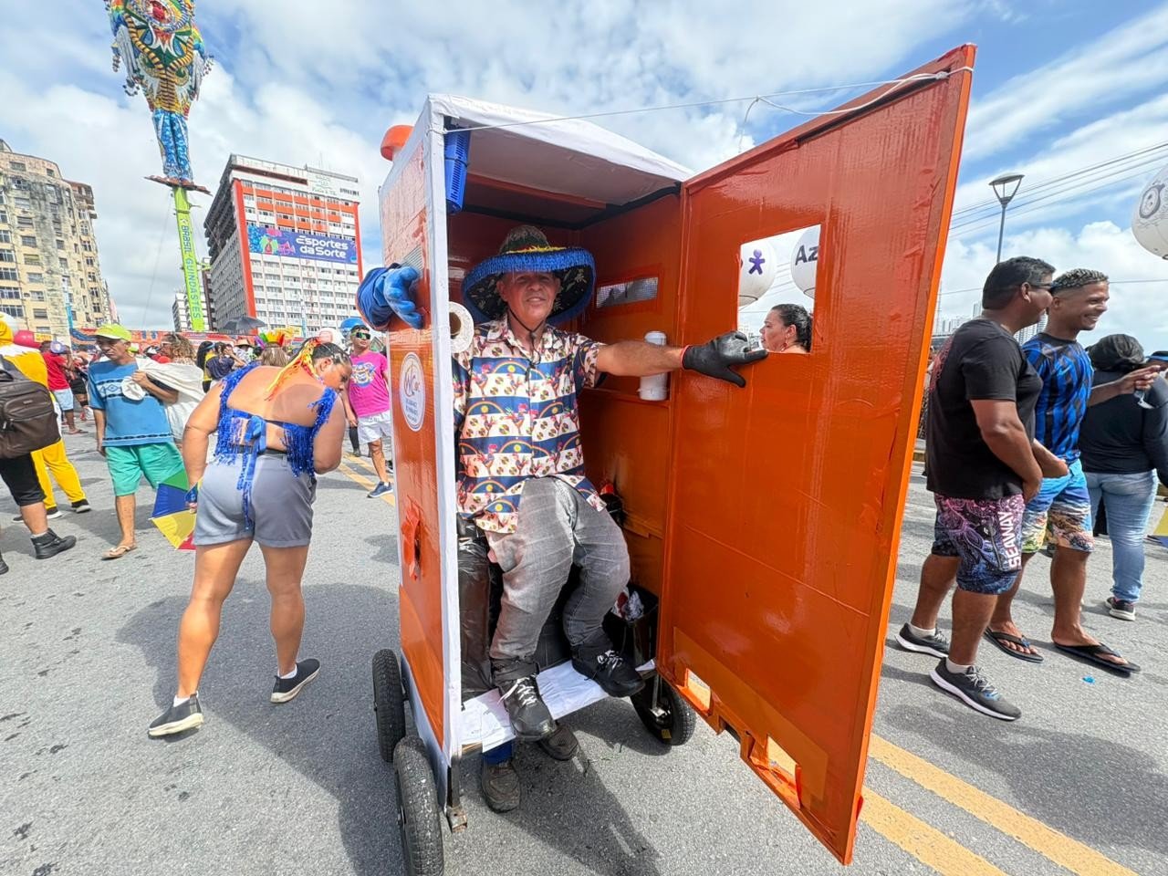 No vibrante Galo da Madrugada, no Sábado de Zé Pereira, um folião se destacou ao unir praticidade e criatividade. Vestido como um banheiro químico, completo